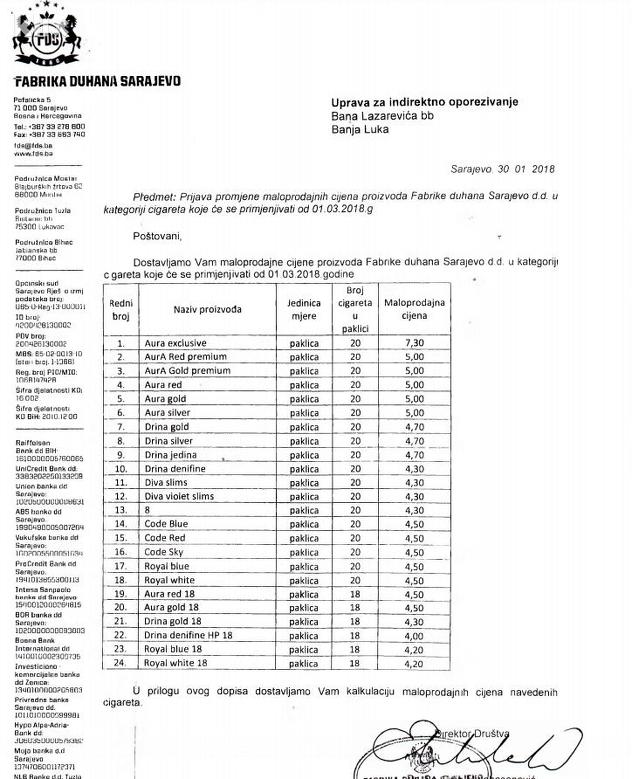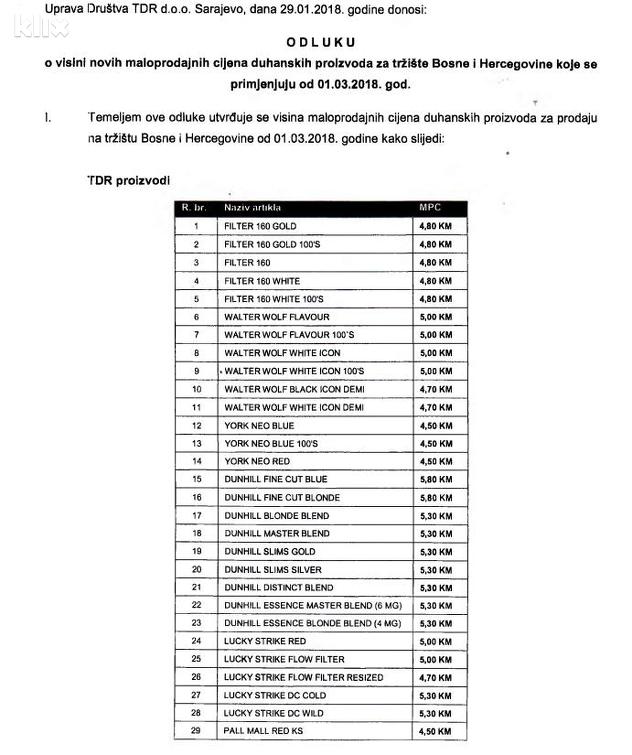 "Kompanije TDR d.o.o. Sarajevo i Fabrika duhana Sarajevo dostavile su UIO nove maloprodajne cijene cigareta koje će biti u primjeni od 1. marta 2018. godine. Prema dostavljenim kalkulacijama novih maloprodajnih cijena cigarete će poskupjeti uglavnom za 0,10 KM po paklici, dok će samo nekoliko vrsta cigareta poskupjeti za 0,20 KM po paklici", potvrđeno je za Klix.ba iz Uprave za indirektno oporezivanje BiH.