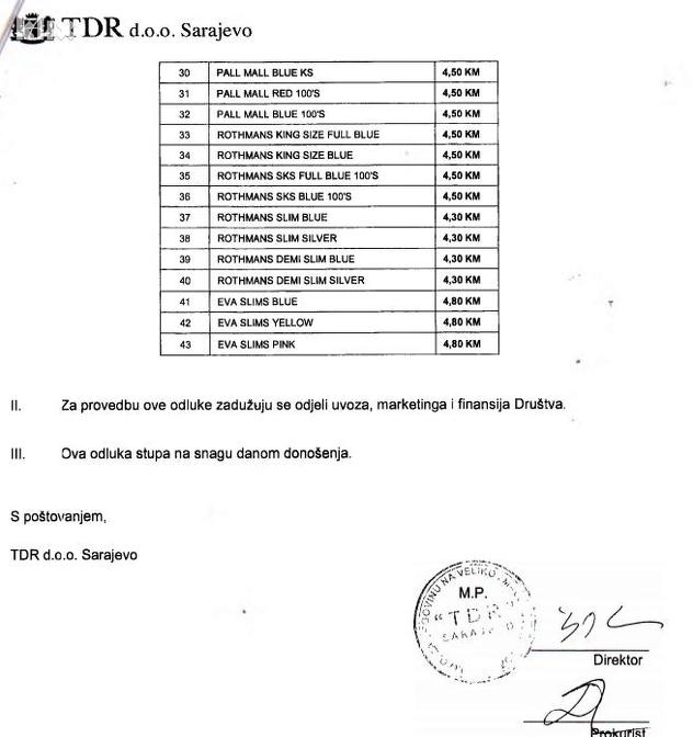 "Cijene BAT proizvoda podižu se kao posljedica usklađivanja s rastom akciza. Cijene podižemo postupno, a ne odjednom kako bismo potrošačima olakšali prilagođavanje na nove cijene. Napominjemo i kako smo dio tereta rasta akciza preuzeli na sebe te cijene nismo povećali proporcionalno rastu akciza. Kao što smo više puta upozoravali, ovakav akcizni sistem uzrok je velikog udjela crnog tržišta koje je u BiH veliki problem. Zbog toga podržavamo napore Upravnog odbora Uprave za indirektno oporezivanje koji je oformio radnu grupu kako bi se analizirao akcizni sistem i donijele potrebne promjene", potvrđeno je za Klix.ba iz TDR-a koji je inače u vlasništvu American British Tobacca.