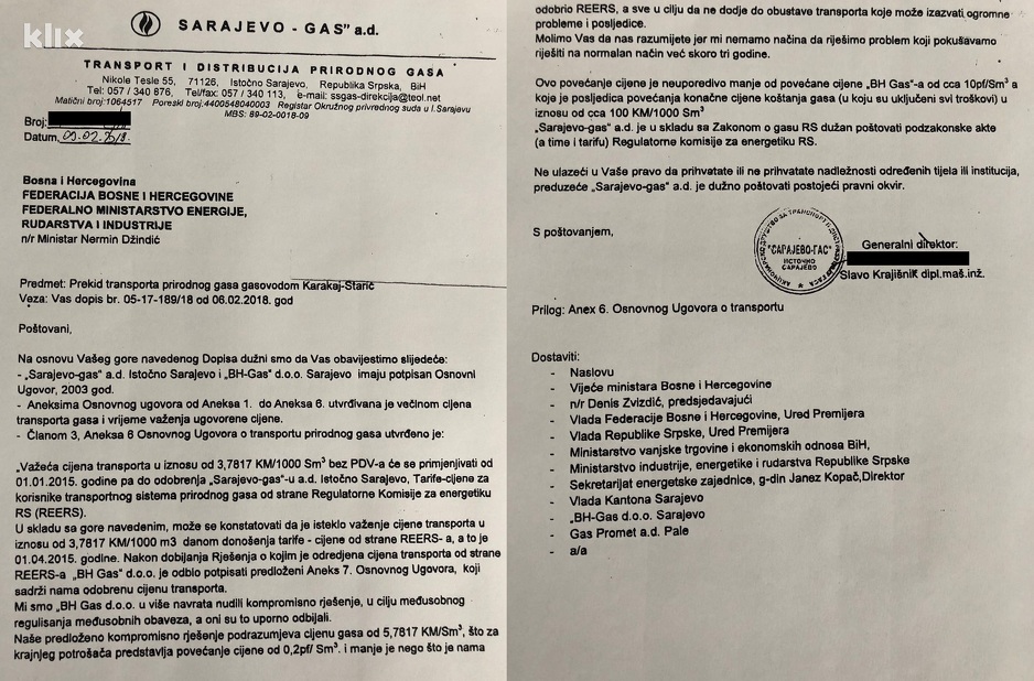 Generalni direktor firme Sarajevo-gas Slavo Krajišnik podsjetio je u dopisu da su dvije firme, Sarajevo-gas iz Istočnog Sarajeva i BH-Gas iz Sarajeva, imale potpisan ugovor iz 2003. godine i da je aneksima utvrđena cijena transporta gasa i vrijeme važenja ugovorene cijene.